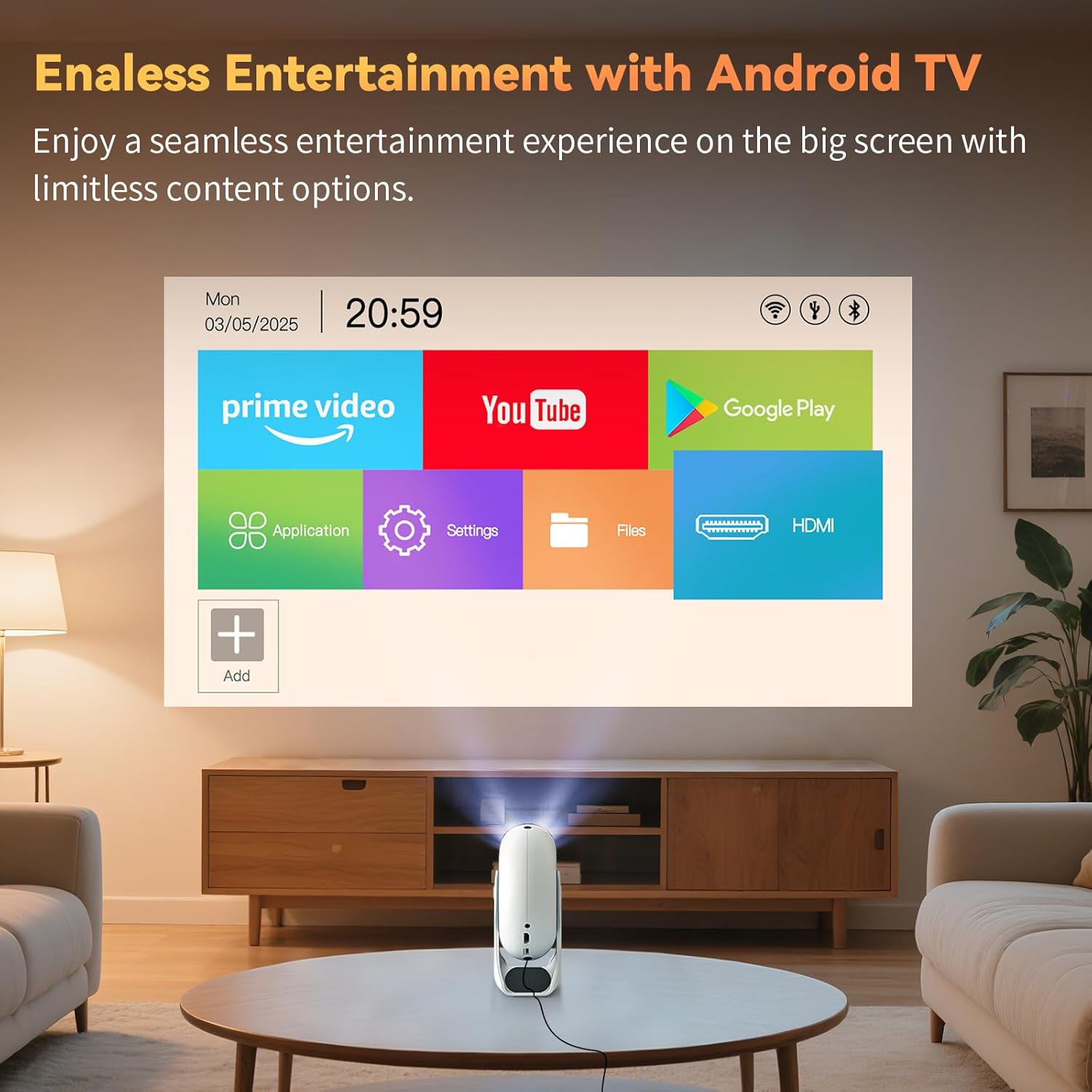 【Android Projector with WiFi & Bluetooth】Powered by Android TV 11.0, this smart projector supports popular apps like YouTube, Prime Video, Netflix and other apps. Dual-band WiFi and Bluetooth allow wireless streaming.