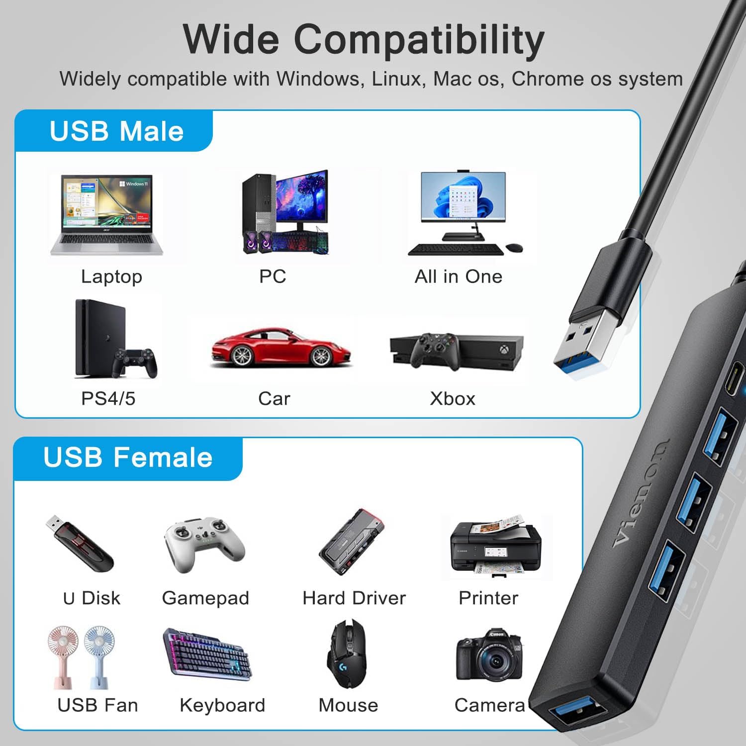 【Wide Compatibility】: Widely Compatible with USB A port Laptop/PC/Desktop XPS, PS4, Xbos and More devices, and Works on Windows, ChromeOS, Linux. Perfectly solve the problem of insufficient USB interfaces on your device, greatly improving daily work efficiency.