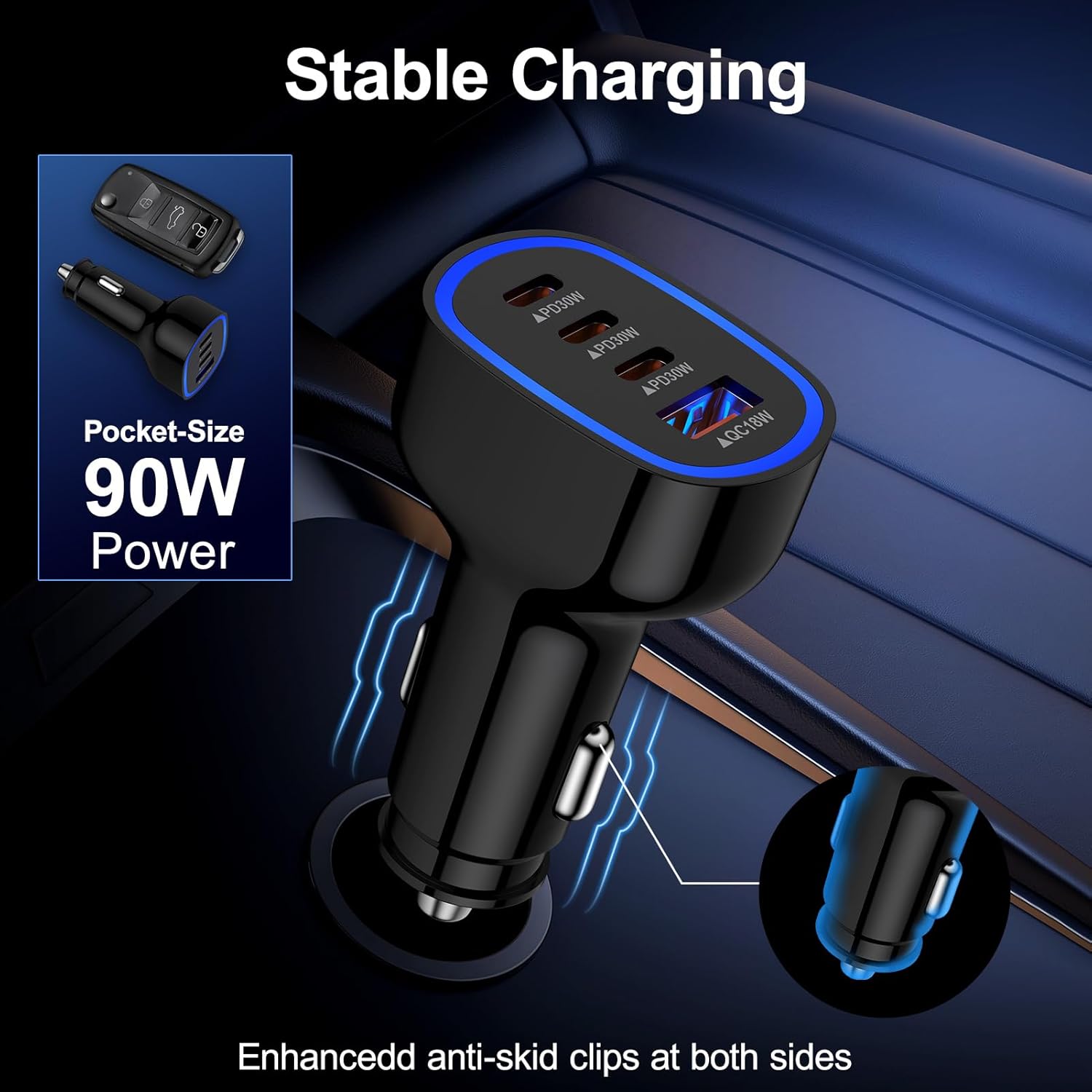 1. This car charger adapter featuring 3 usb-c ports + 1 usb-a ports, ALL Ports charges up to a maximum power of 90W.
