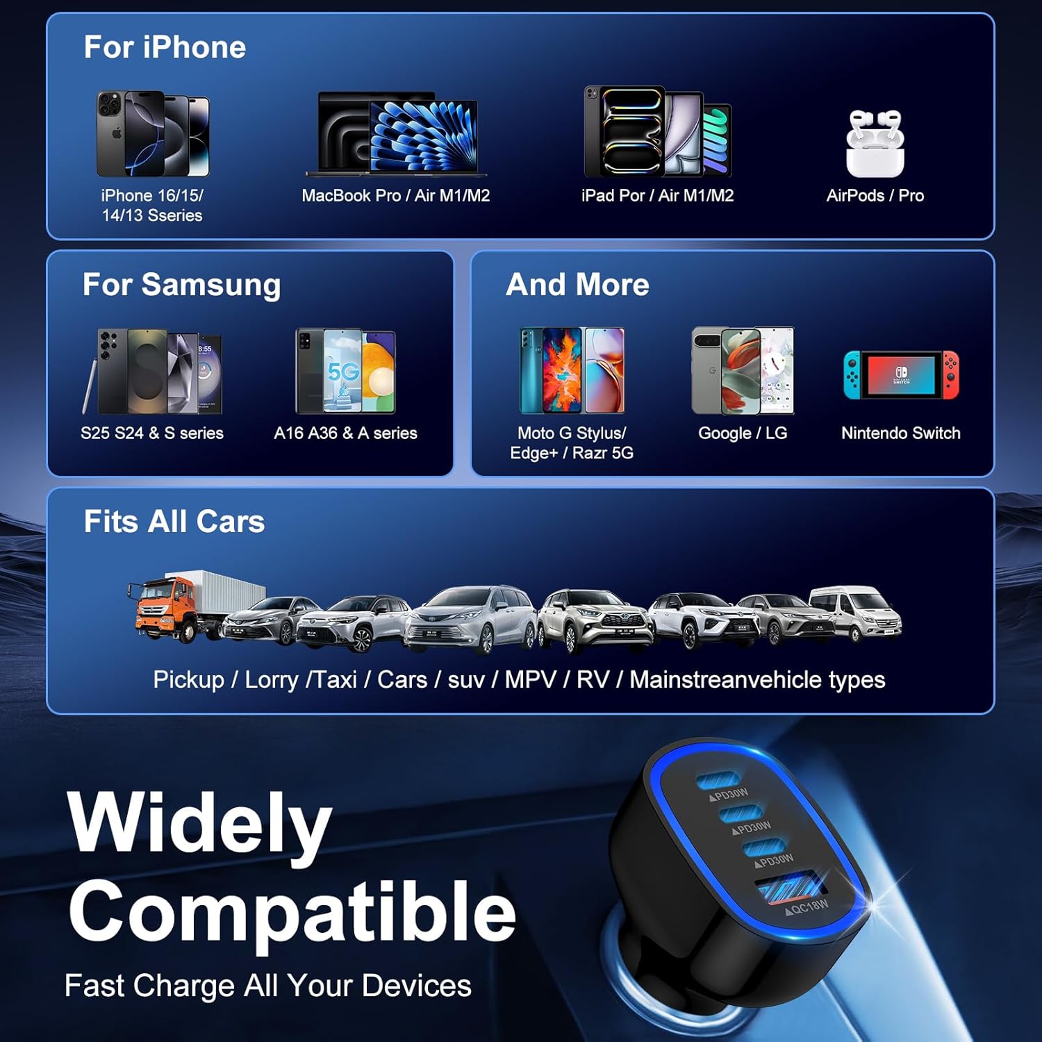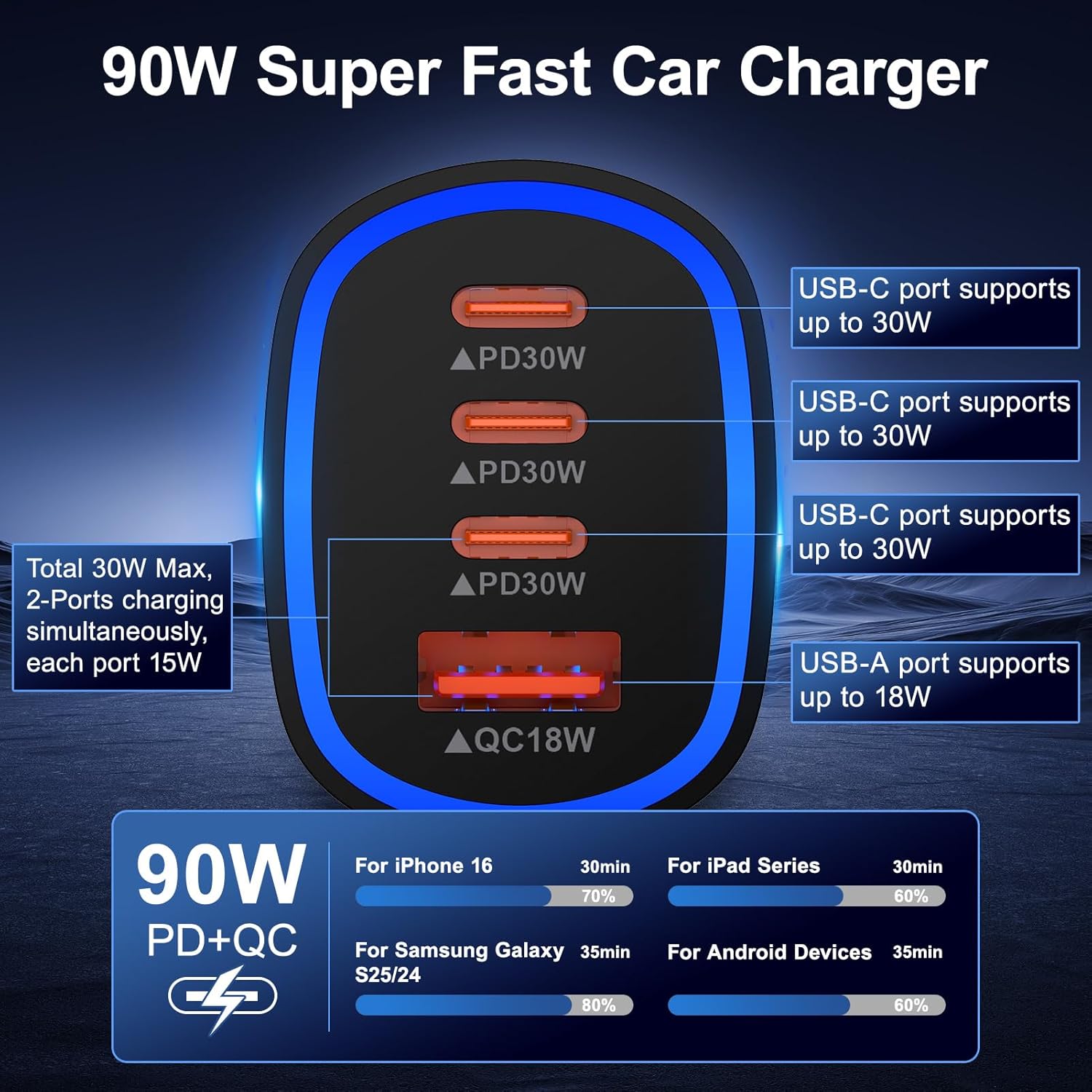 Widely Compatibility: 90W 4-Port super fast car charger accessories fits for all USB-C & USB-A devices. The usb c car charger fast charging for Samsung Galaxy A16 5G A36 A26 S25 Edge S25 Ultra S25+ S25,Z Fold 6 5 4 3 2 Fold6, Z Flip 6 5 4 Flip6, S24 FE,S24 Ultra S24+ S24,A55 A35 S23 Ultra S23+ S23 FE S23,S22 Ultra S22+ S22,S21 Ultra S21+ S21 FE S21,S20 series, A56 A15 A25 A54 A14 A24 A34 A13 A53 A33 A23 A12 A32 A52 A51 A70 A71 A72 A80 A90; iPhone, Google Pixel, Tablet, ect.