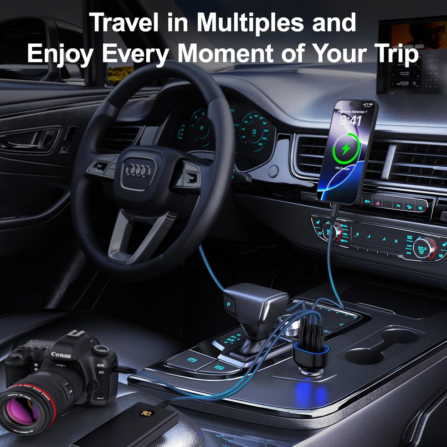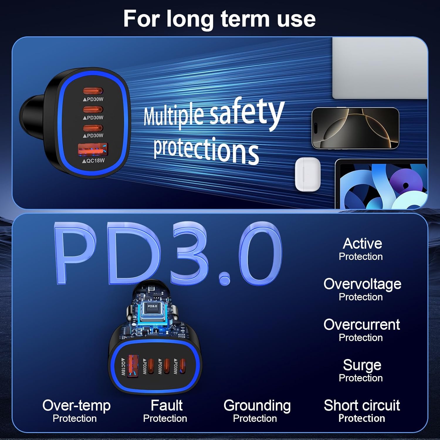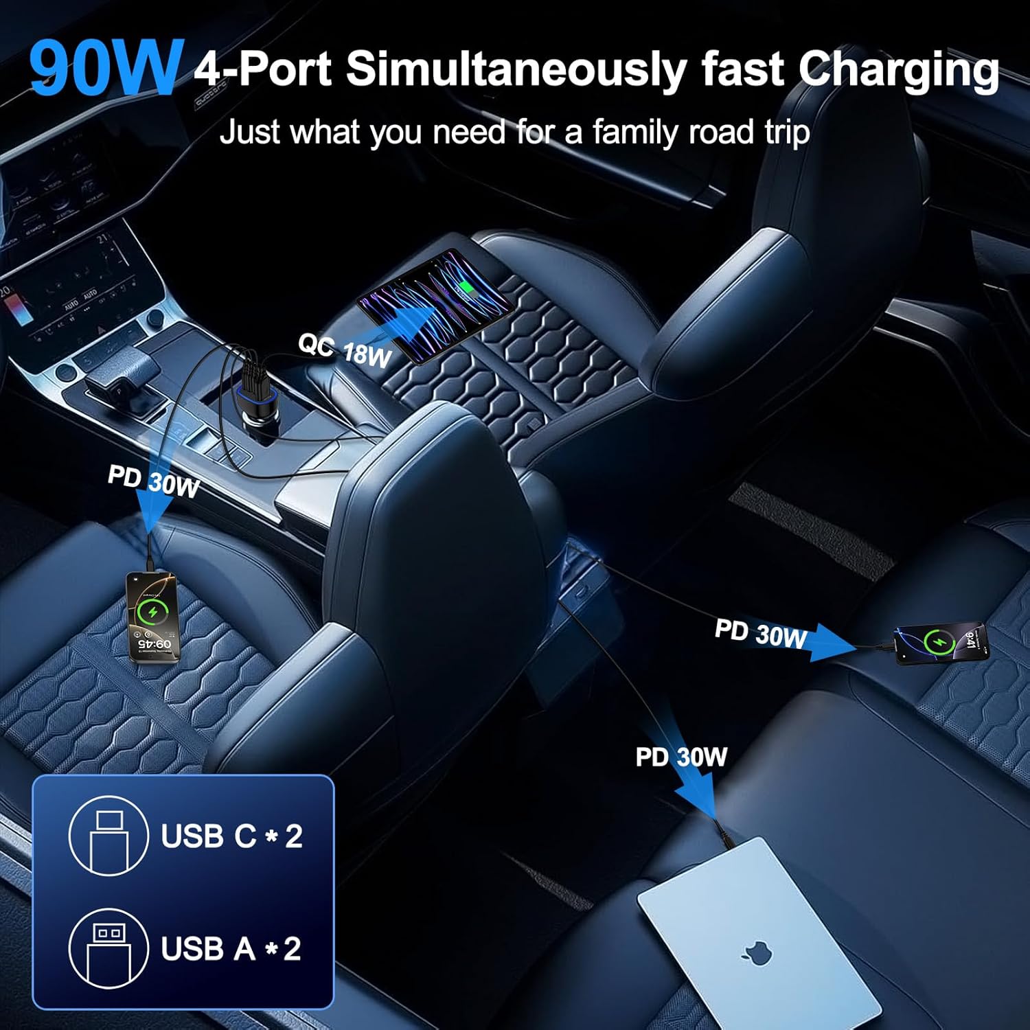 4-Port Fast Samsung Car Charger: 90W samsung a36 car charger adapter equipped with 3 USB-C ports and 1 USB-A ports, support PD 30W Max (USB-C) and QC 18W Max (USB-A) output, the cigarette lighter usb charger can fast charge all usb a and uab c devices. 4 usb ports charging simultaneously, the frist usb-c port and the second usb-c port all support 30W Max, the third usb-c port and usb-a port shares 30W Max. Samsung a16 usb car charger is the best partner for family trips.