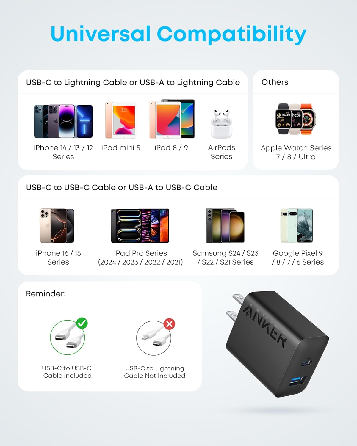Model Number A2348 Anker Charger (2-Port, 20W) The Dual-Port Compact Fast Charger Versatile Compatibility For USB-C to USB-C Cable Compatible Devices: iPhone 15 / 15 Pro / 15 Pro Max /iPad Pro 11-inch (1st Generation or Later) /iPad Pro 12.9-inch (3rd Generation or Later) /iPad Air (4th Generation or Later) /iPad mini (6th Generation) Versatile Compatibility For USB-C Plug Compatible Devices (USB-A or USB-C to Lightning Cable Not Included): iPhone 14 Series /iPhone 13 Series /iPhone 12 Series /iPhone SE (2nd Generation) /iPad mini (1st-5th Generation) /iPad Air (1st-3rd Generation) /iPad Pro 12.9-inch (1st-2nd Generation) /AirPods Pro /AirPods (1st-3rd Generation) /Apple Watch (Series 1-8)/ Apple Watch Ultra Versatile Compatibility Other Devices: AirPods Pro / 3 Nintendo Switch Total Wattage 20W Input 100-240V~1A 50-60Hz Output 1 Port Output USB-C: 5V⎓3A / 9V⎓2.22A / 12V⎓1.67A (20W Max) USB-A: 5V⎓3A / 9V⎓2A / 12V⎓1.5A (18W Max) Output 2-Port Output USB-C + USB-A: 5V⎓1.5A + 5V⎓1.5A (15W Max) Weight 52 g Dimensions 27.7 × 42.8 × 44.5 mm / 1.0 × 1.6 × 1.7 in Note To charge Apple devices such as iPhones with a Lightning connector, you need to use a USB-C to Lightning cable (not included). Note Anker 20W Wall Charger (2 Ports) meets the standards of UL 62368-1:2019/R:2021-10 and CSA C22.2 No. 62368-1:2019/U1:2021-10.