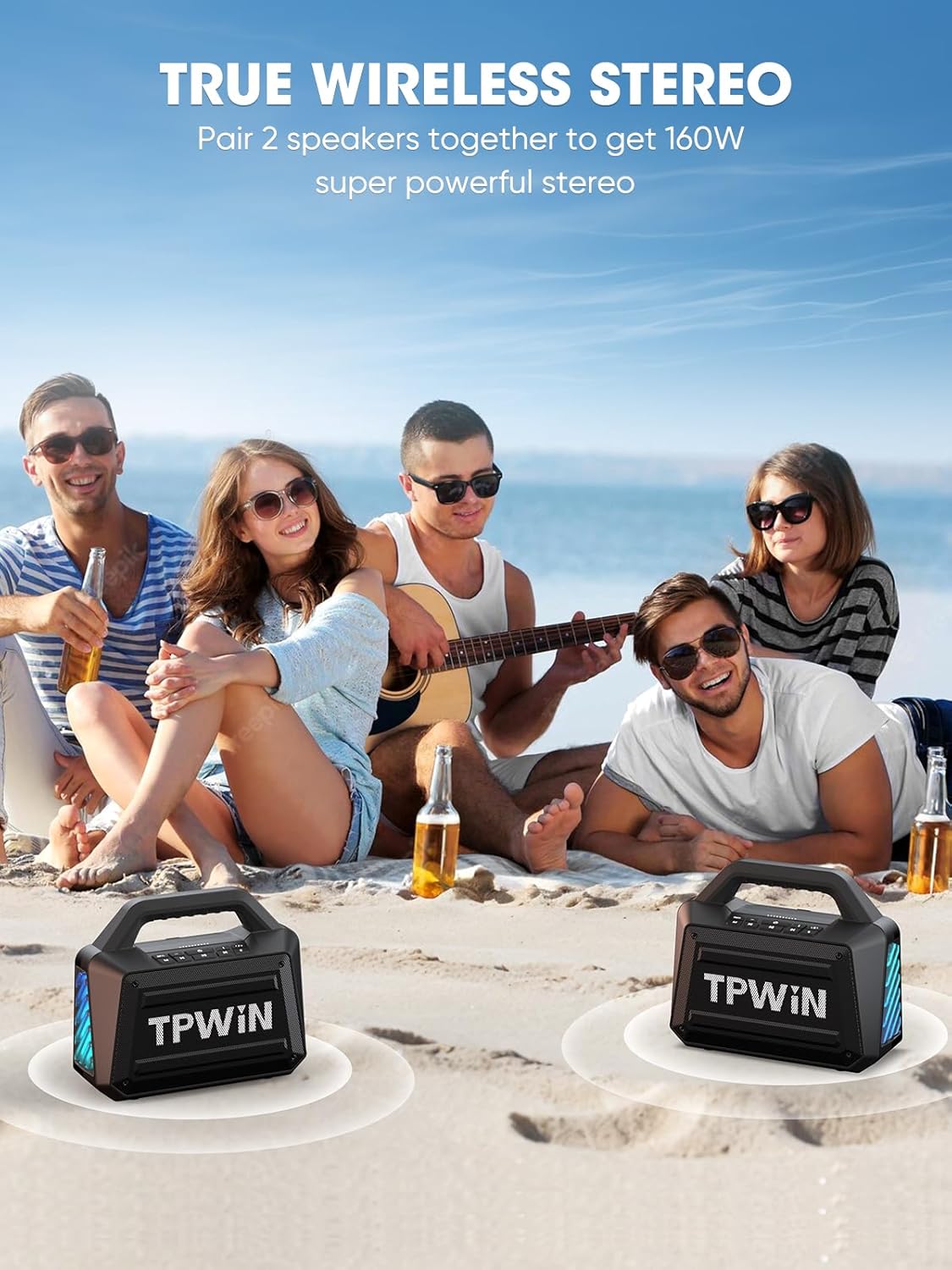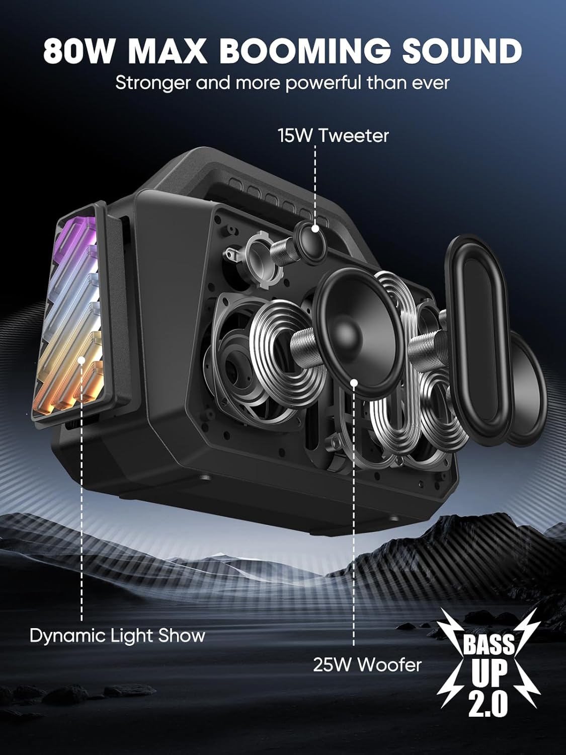 【80W Max Booming Sound】The wireless bluetooth speaker, engineered with dual 25 W(peak) subwoofers and dual 15 W(peak) tweeters delivers powerful sound in a portable, waterproof design. Portable speaker gives you the best listening experience anywhere! Like jobsite, camping, beach, roadtrips