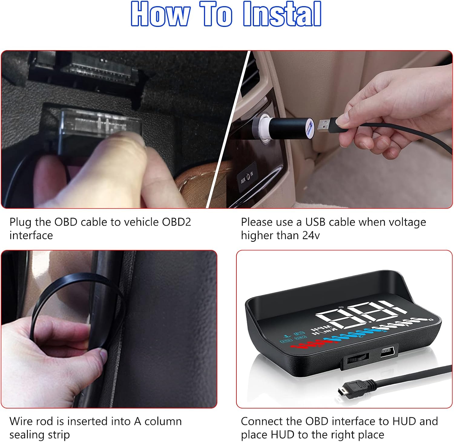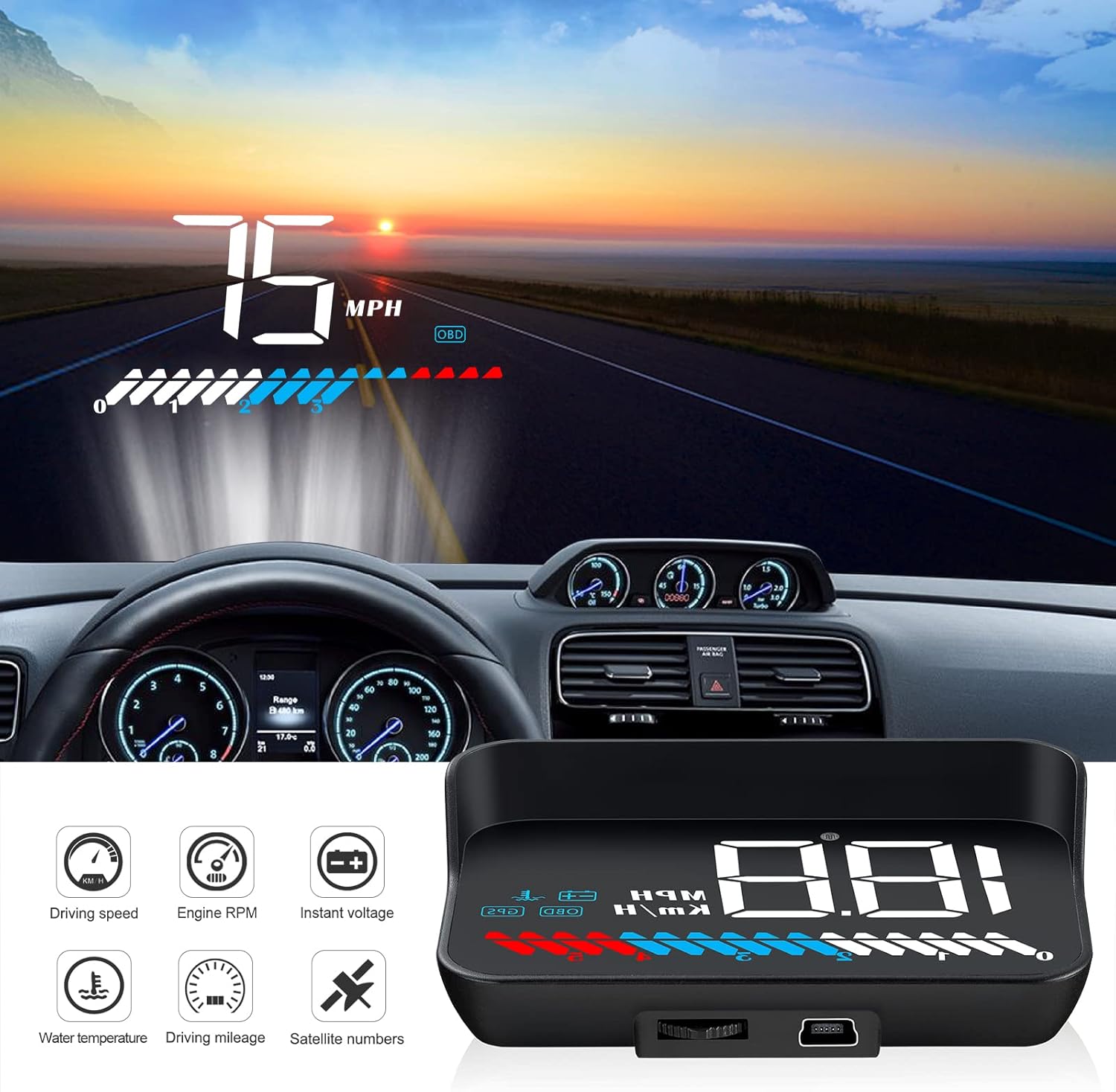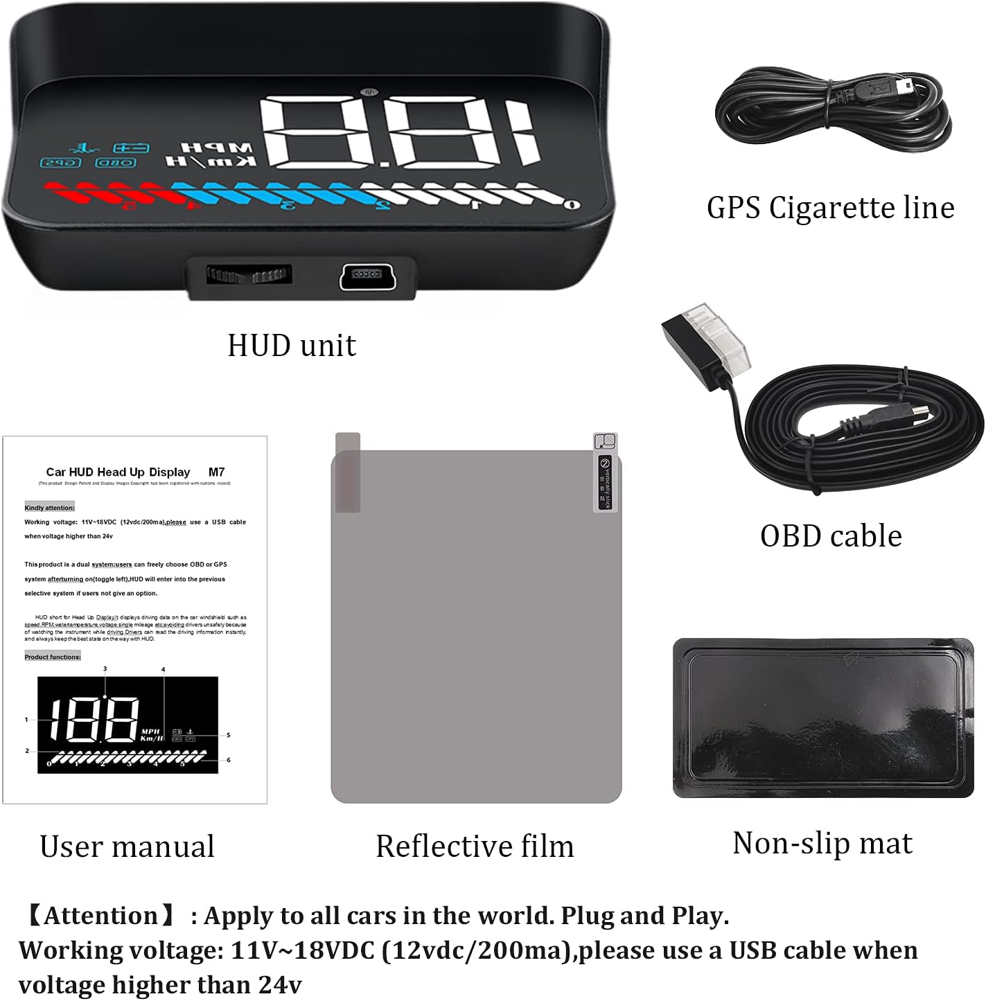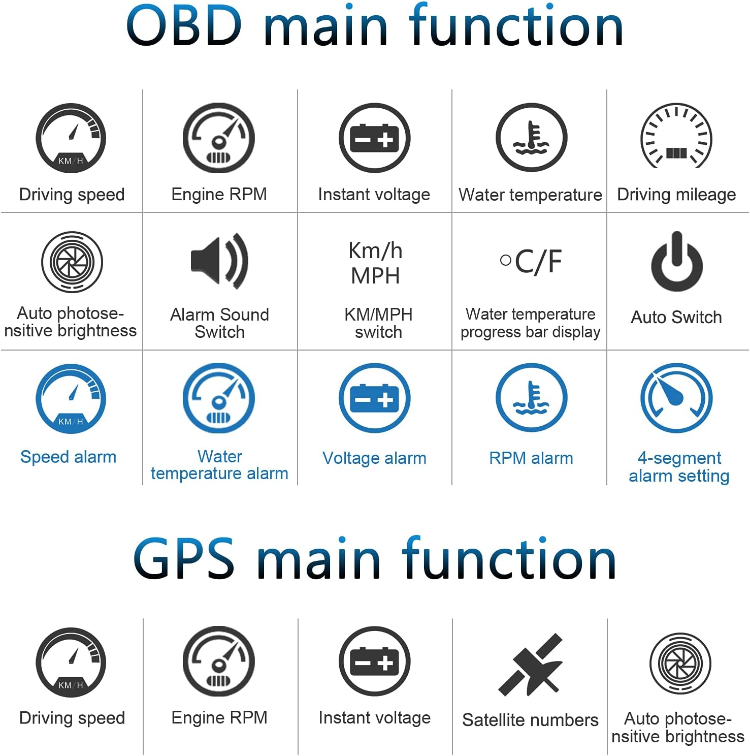 MULTI FUNCTION DISPLAY— In the OBD mode, it can display: speed, water temperature, voltage, driving distance, with the functions of speed alarm, water temperature alarm, voltage alarm, etc.GPS mode can display: speed, voltage, driving distance, with speed alarm , voltage alarm function. HUD can automatically adjust the brightness according to the environment. Speed unit: km / h or MPH. The unit of water temperature is degrees centigrade and degrees Fahrenheit. The unit is adjustable.