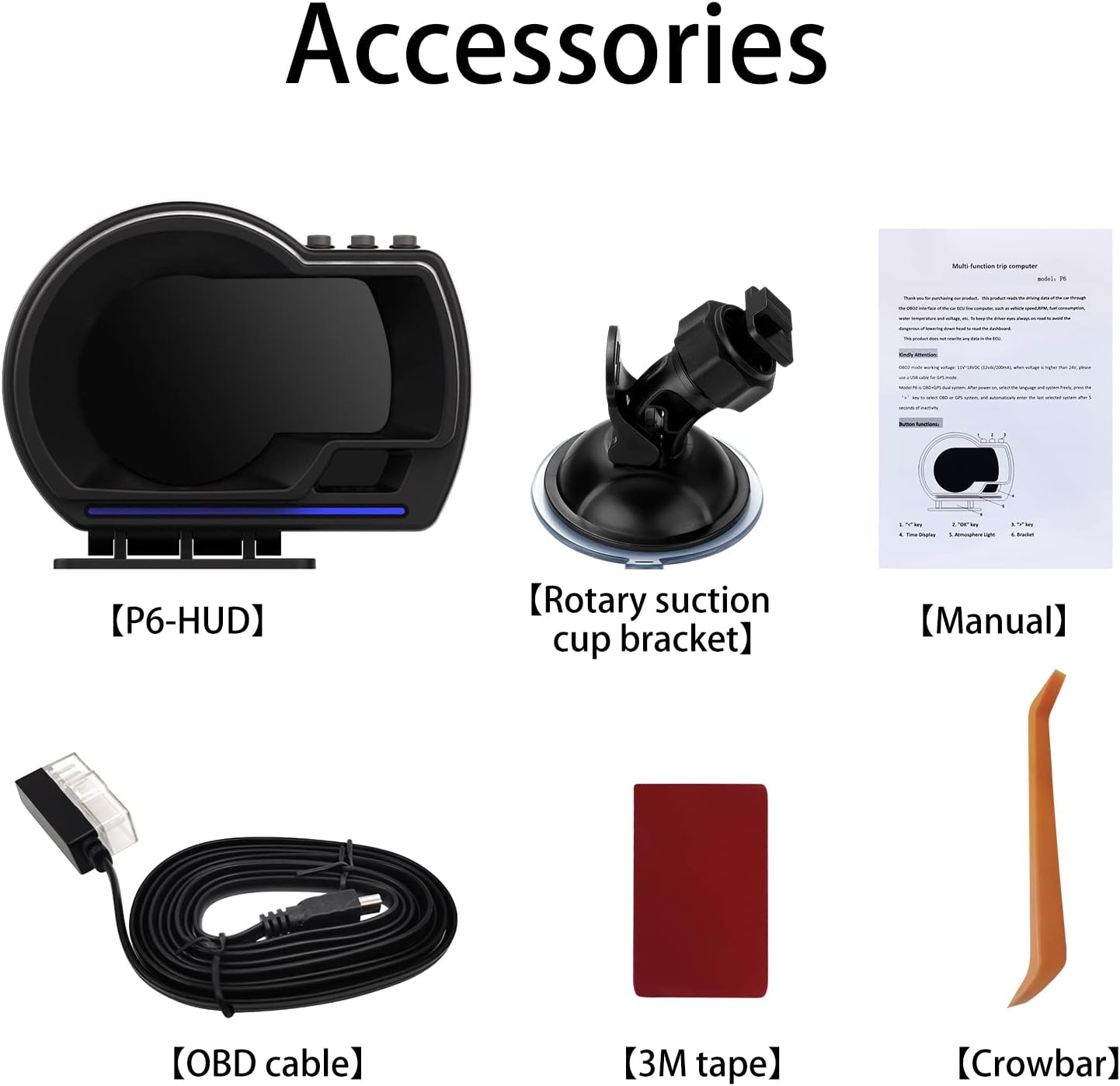 Car HUD Head Up Display P6, OBD+GPS Smart Gauge, Works Great for Most Cars