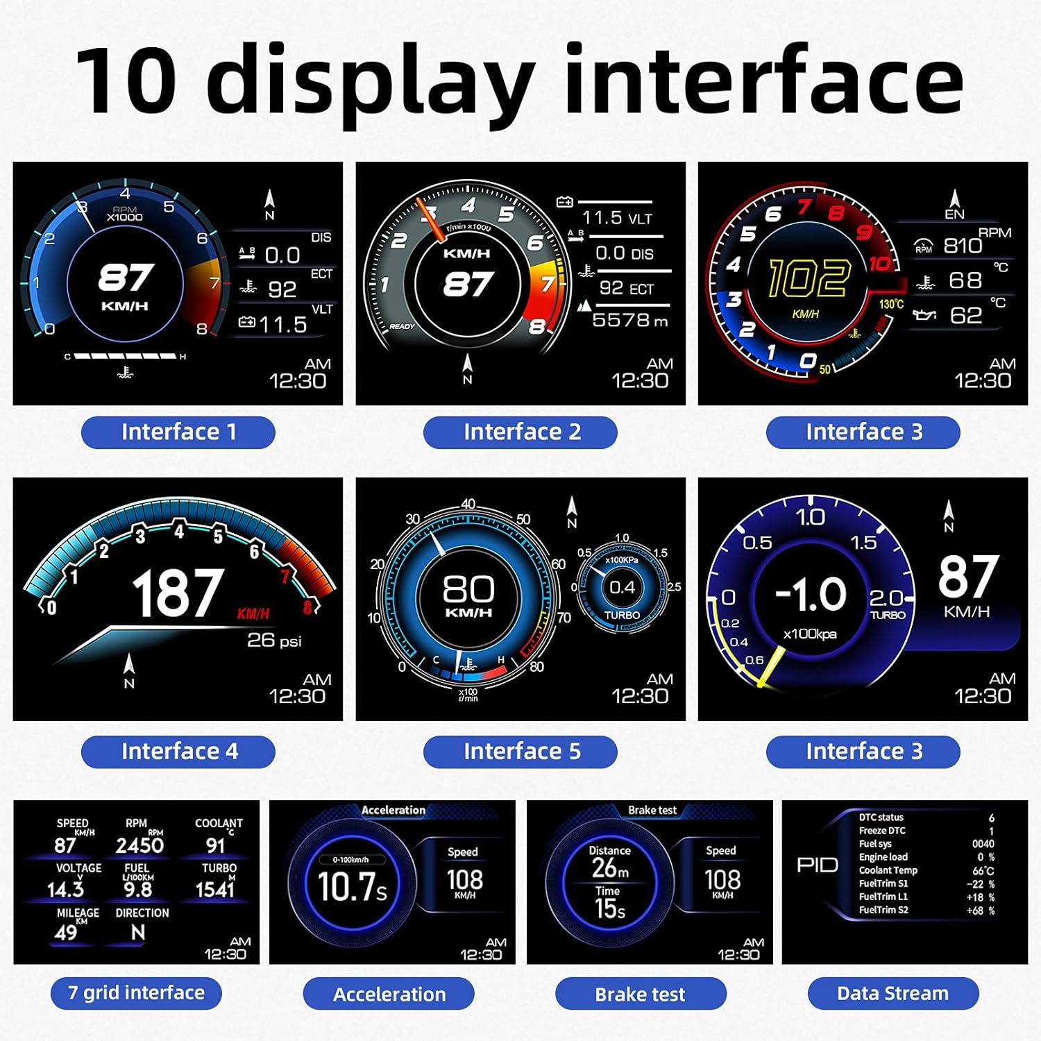 NEW DRIVING EXPERIENCE—-10 kinds interface, free switch, LCD meter, clear fault code, read data stream; 2 install way with adjustable bracket, put on dashboard or stick to windshield, easy operation, non-destructive installation.