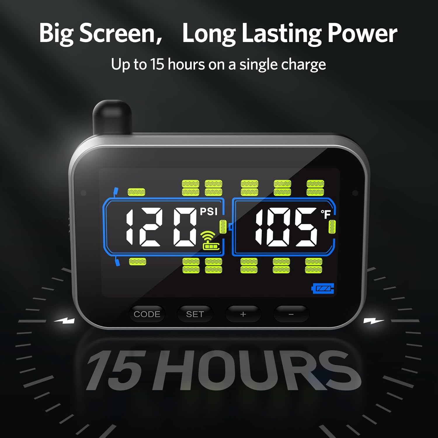 [Real Time Monitoring & Longer Signal Acceptance]: The GUTA RV tire pressure monitoring system accurately monitors tire pressure from 0 to 188 PSI, making it an essential tool for maintaining tire health. This is particularly beneficial for commercial fleets that manage multiple vehicles, ensuring both efficiency and safety. Its long-range connectivity is specifically designed for long vehicles, providing consistent monitoring for RVs, motorhomes, trailers, large trucks, and semi-trucks. This is crucial for ensuring safe cross-country travels and transportation