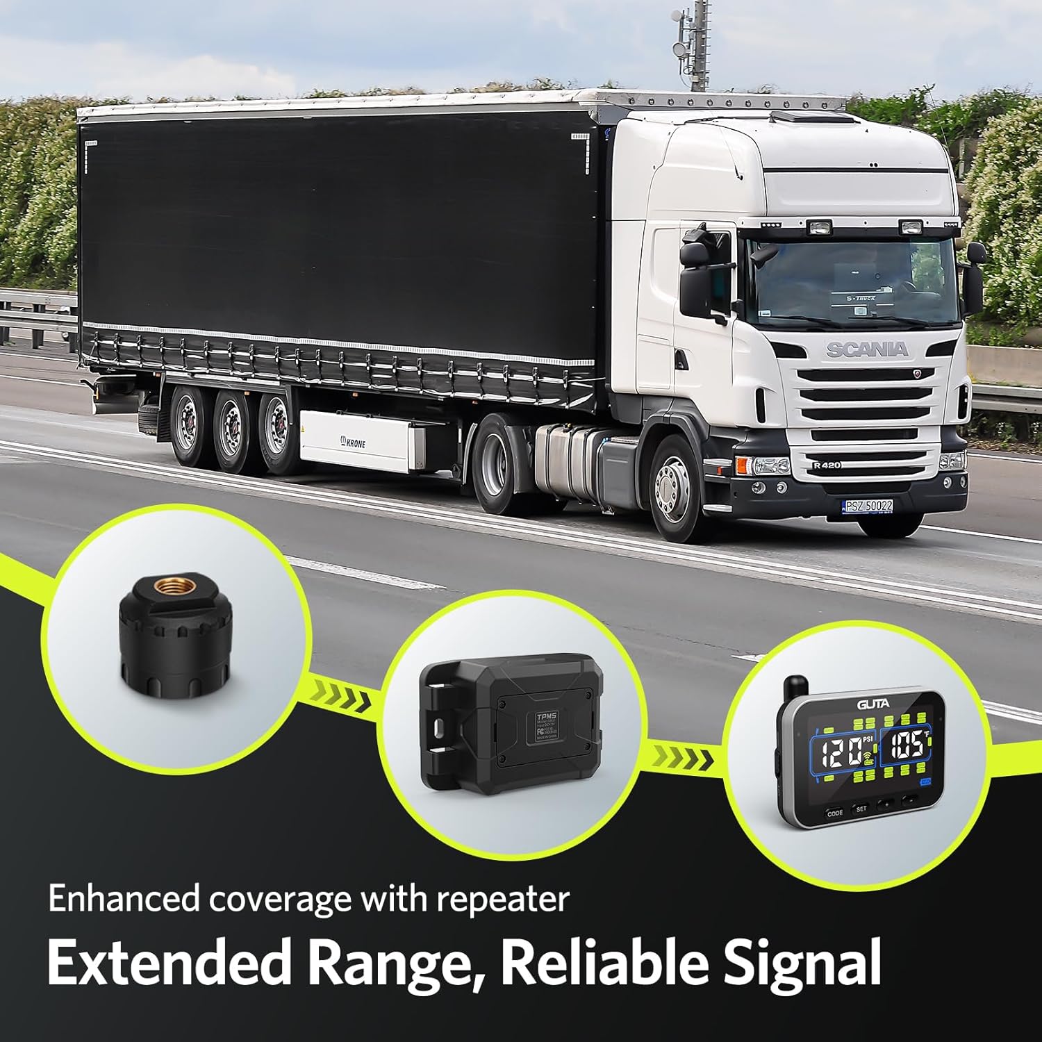 [Advanced Alert System for Up to 24 Tires’ Info]: The GUTA tire monitoring system offers six alert types, including rapid deflation, extreme pressure or temperature variations, and sensor or monitor power status. This system is crucial for proactive safety, benefiting commuters and travelers alike. Available in models starting with four sensors and expandable to 6, 8, 10, or 12 sensors, the GUTA RV TPMS can ultimately pair with up to 24 tires, making it ideal for RVs, trailers, and semi-trucks. Customize your tire monitoring to suit personal travel, larger recreational vehicles, or commercial truck fleets. Note: All models include the new GUTA signal booster except for the four-sensor kit