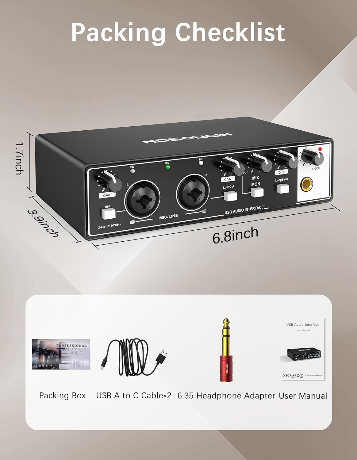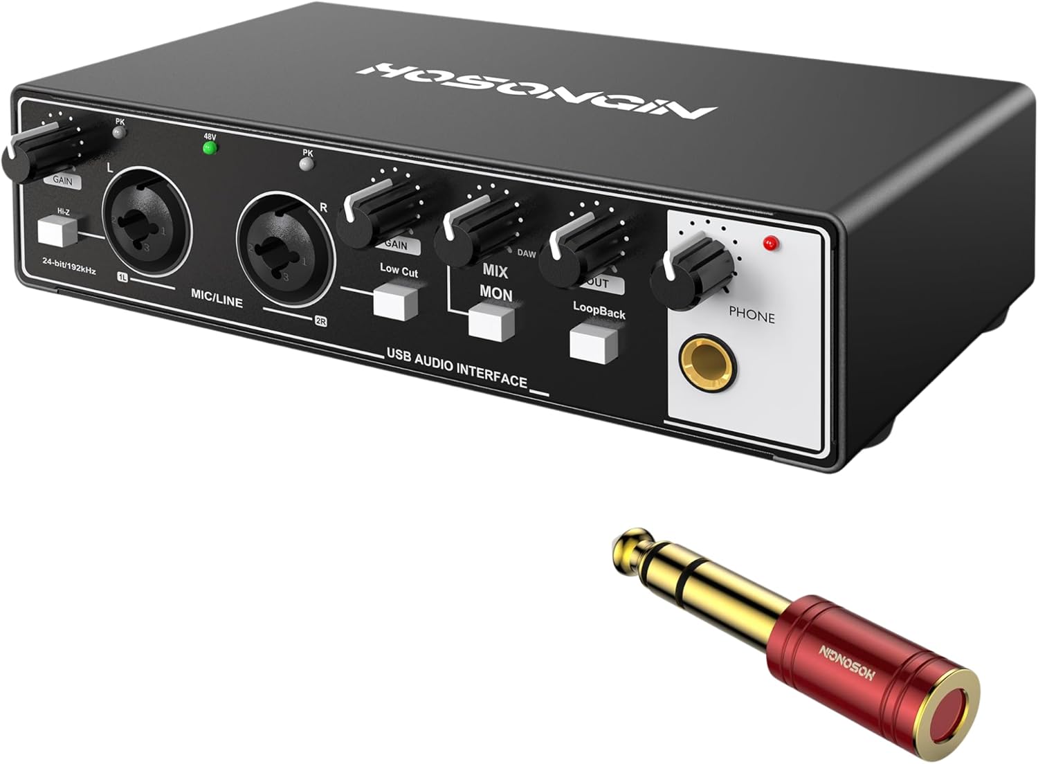 HOSONGIN USB Audio Interface for PC & Mac, Budget-Friendly 24-bit/192kHz Sound Card, Plug-and-Play Mixer for Beginners, Guitar, Podcast, and Streaming with 48V Phantom Power