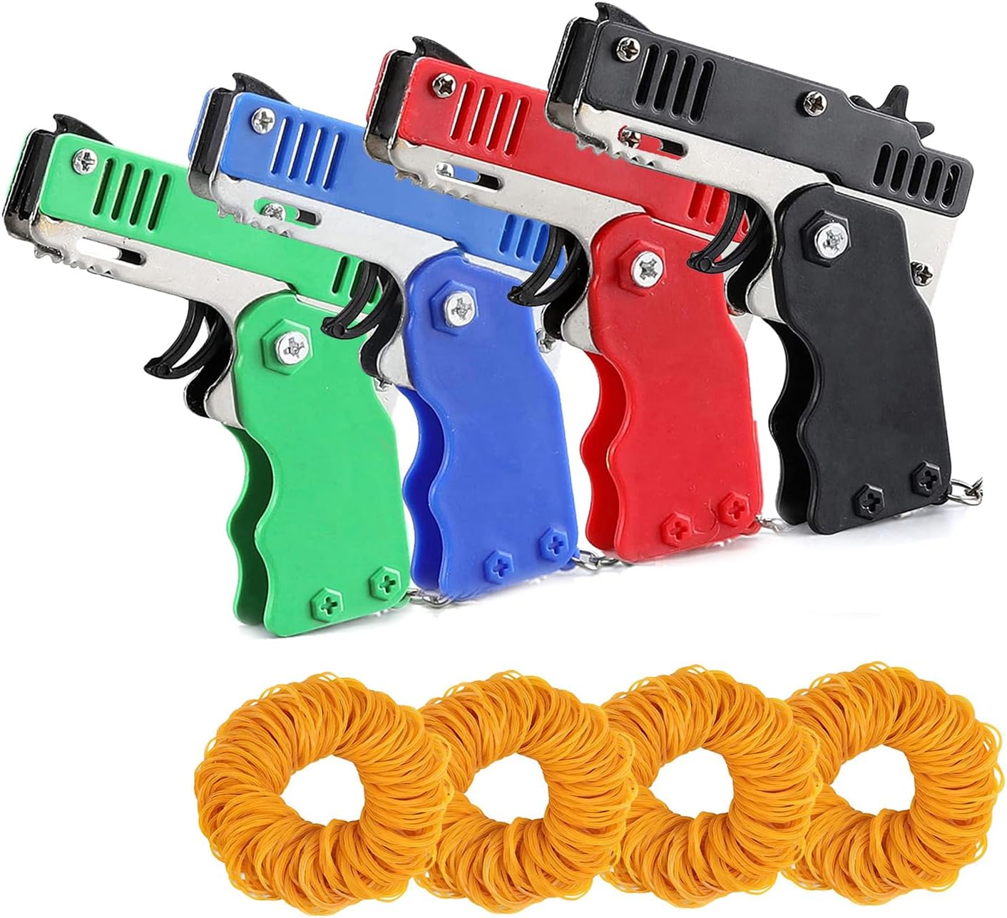 Kids Toys Cool Keychain Rubber Band Launcher Toy 4pcs Mini Metal Folding Rubber Launcher Toy with 240 Elastic Rubber Bands for Game Outdoor Activities (4 Colors)