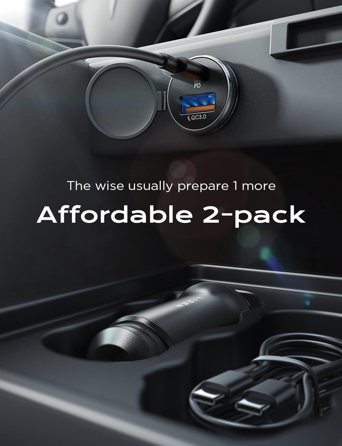 AFFORDABLE 4-PACK, 2 CAR CHARGES + 2 USB-C CABLES: Perfect for multi-car families or as gifts, this set ures you’re always prepared with a backup. LISEN’s 2-pack car chargers adapter provide a safety net for any journey. Included are two 60W USB-C to USB-C cables, capable of super-fast charging for the iPhone 15 series, Samsung devices, and more. Convenient and cost-effective, it eliminates the need for additional cable purchases, making charging hassle-free and efficient.