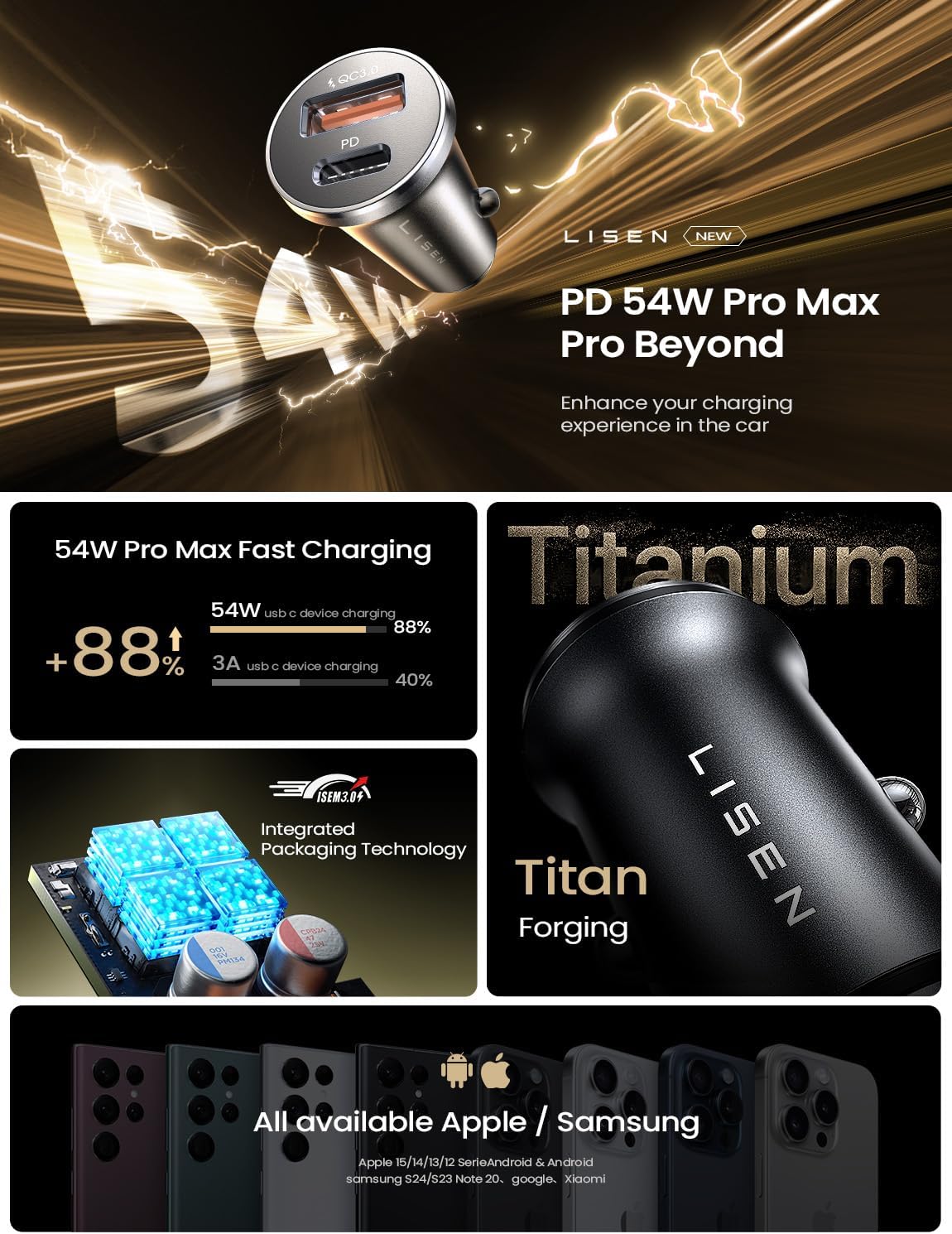 DUAL FAST CHARGING PORT: The LISEN fast charging USB C car charger is a powerhouse of efficiency, supporting both PD 36W and QC 18W high-output standards to rapidly fuel a wide range of phones and electronic devices. Versatile and user-friendly, it features both USB-A and USB-C ports, accommodating various cable types for seamless charging experiences. [NOTE: The fast car charger usb c CANNOT fast charging 2 devices simultaneously.]