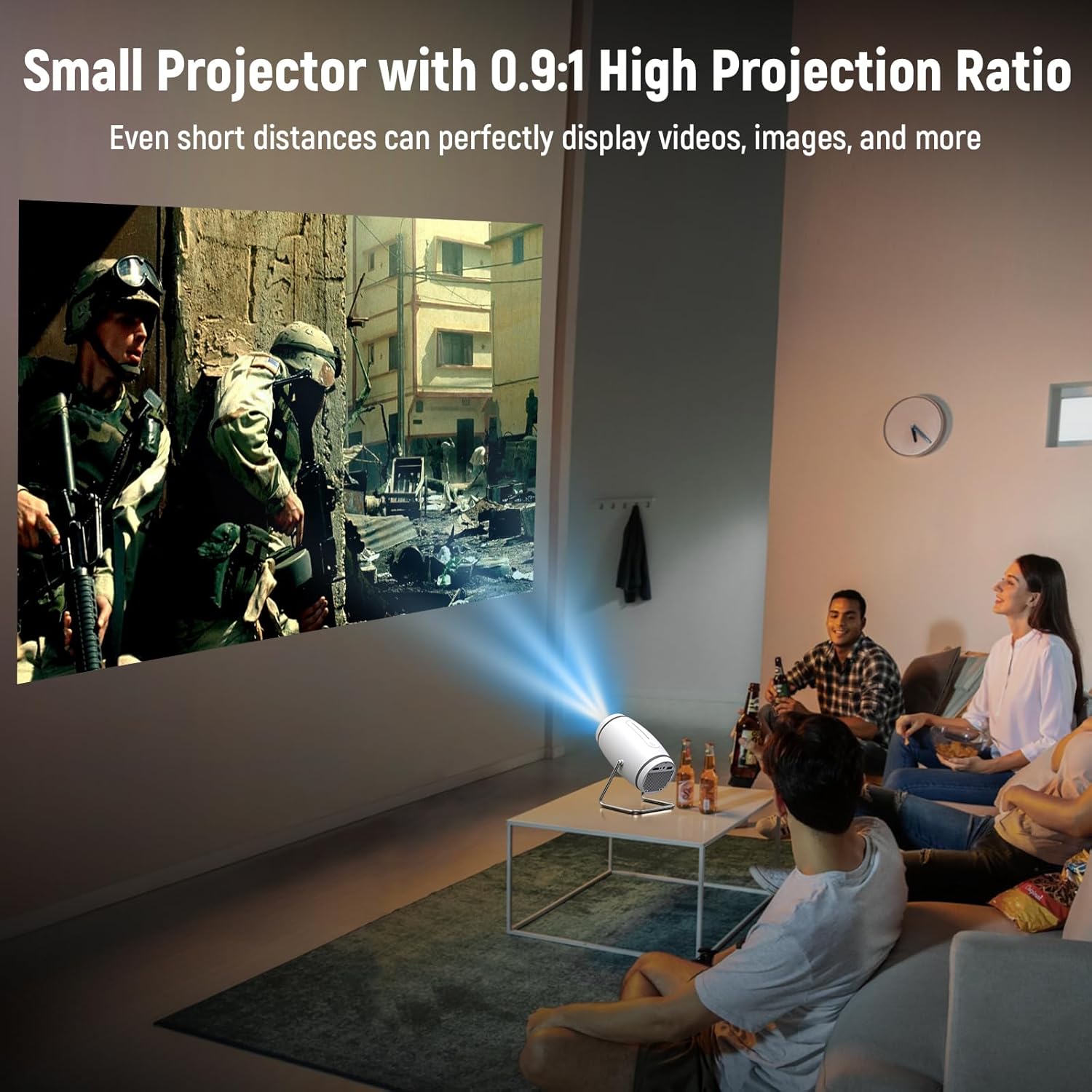 ✅0.9:1 High Projection Ratio:Project a cinematic experience from compact spaces. Our projector 4k is equipped with 0.9:1 high projection ratio, which can project a bigger picture in a shorter distance, more suitable for small spaces, such as bedrooms, small living rooms and so on.