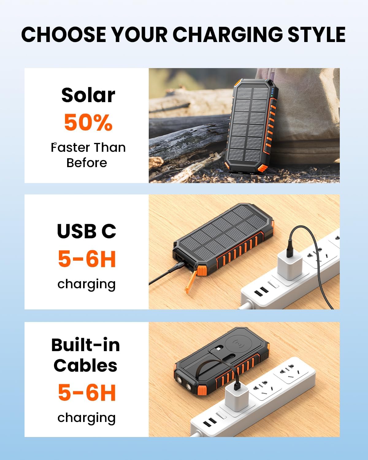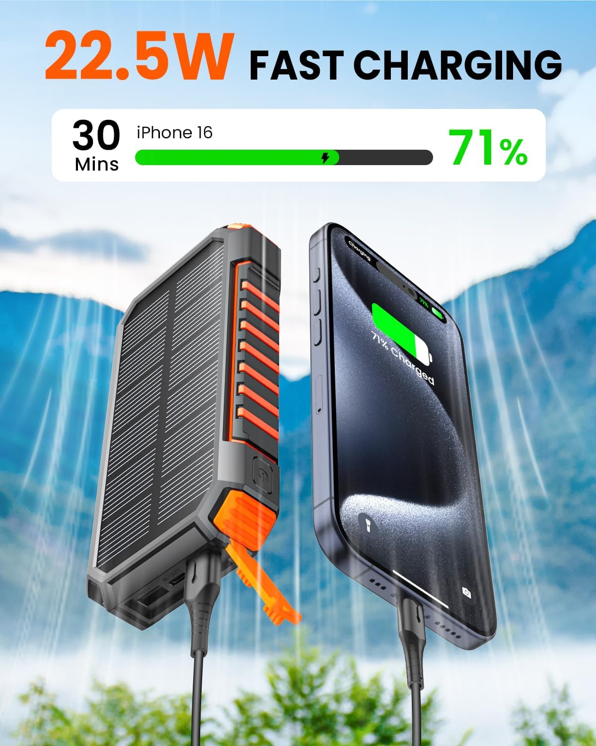 Massive 27,000mAh Battery Capacity: Stay powered for days with the impressive 27,000mAh battery. Fully charge your iPhone 16 up to 8 times, Galaxy S23 up to 6 times, or iPad Mini 6 up to 4 times. Perfect for power outages, outdoor adventures, or everyday use, this solar power bank delivers reliable, long-lasting energy.
