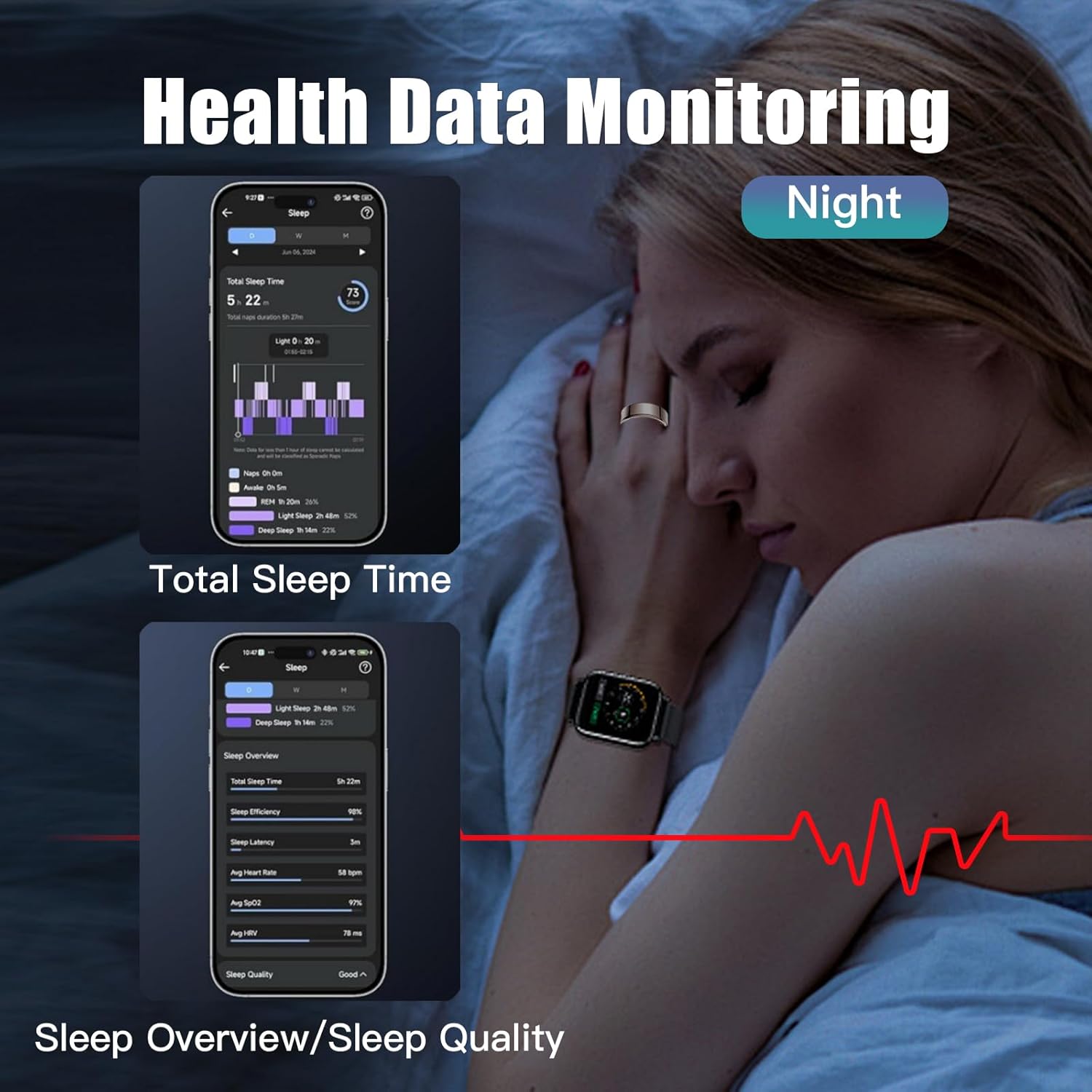 【Smart Sleep Tracker】: This sleep ring can monitor your sleep and provide sleep music to help you fall asleep. Monitor your onset, wake time, sleep quality (deep and light sleep). You can view daily, weekly, and monthly sleep data in the app to help you adjust your habits and improve your sleep quality