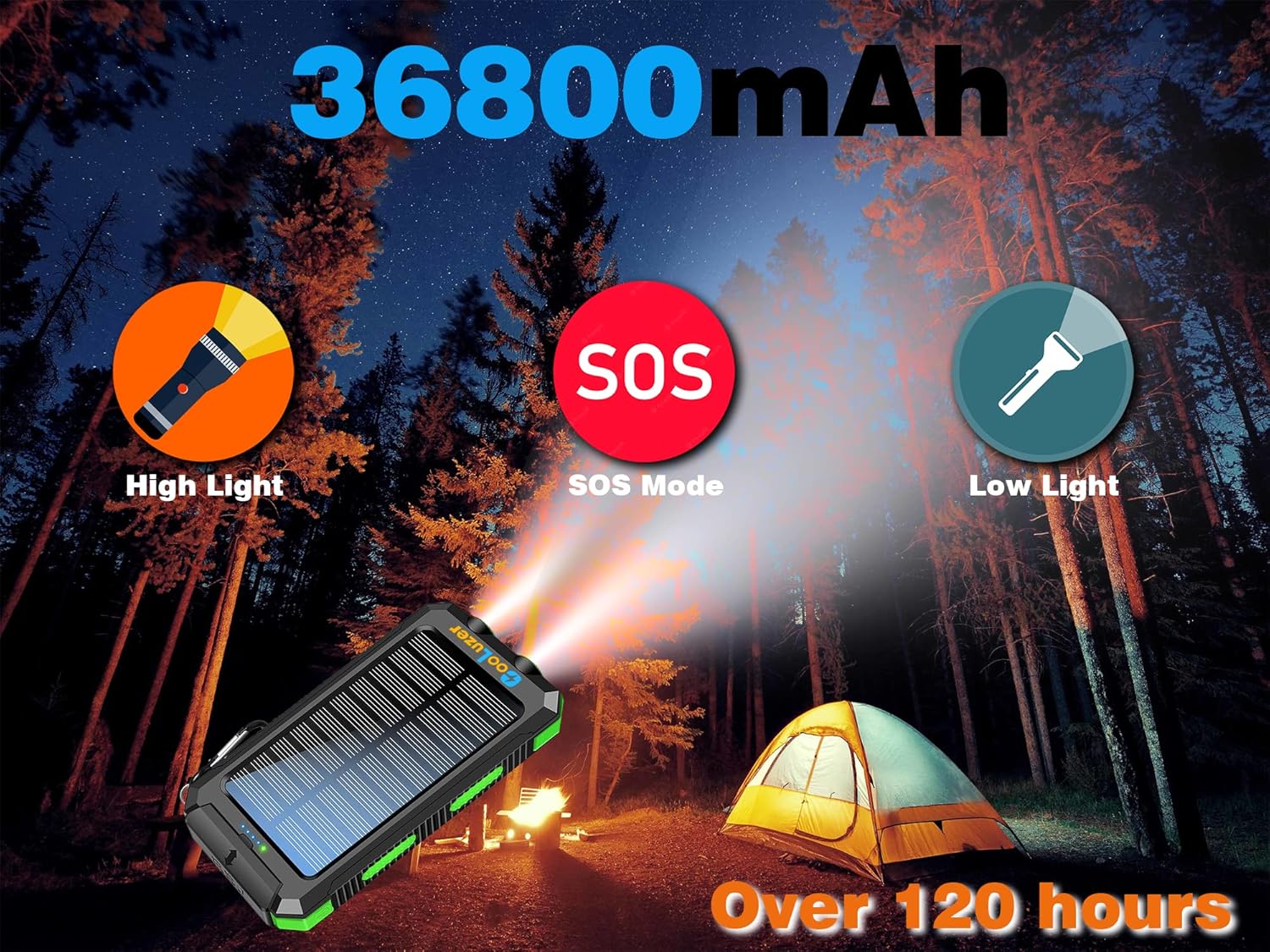 ⚡【Use Occasion & Customer Service】⚡It is a perfect outdoor equipment or camping gear accessory for hiking, camping, cycling, fishing, traveling, and beaches. The power bank pass CE, UL PSE testing. the full package contain: 1* 36800mAh Solar charger, 1*Micro USB cable, 1*Carabiner, 1* User manual. we offer 24hours online after-sales service. If you have any question, please contact us to get support.