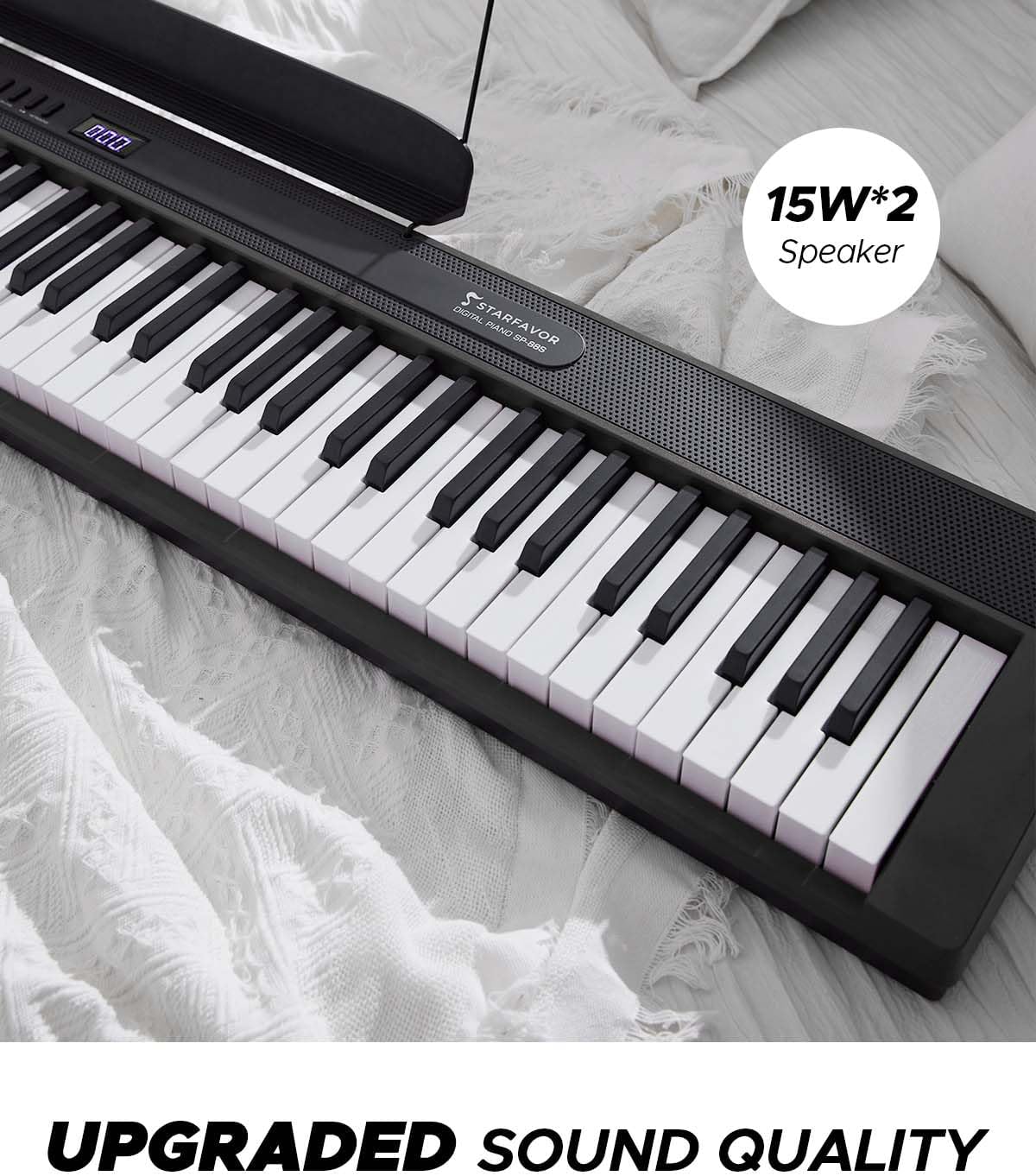 Piano Bundle: Starfavor Piano package comes with a full kit for piano beginners and advanced players: Piano Stand, Sustain Pedal, Carrying Bag, Headphones, Music Holder and Book Clip, Piano Key Stickers, User Manual, Cleaning Cloth and Power Adapter. Once you get the package you’re ready to go