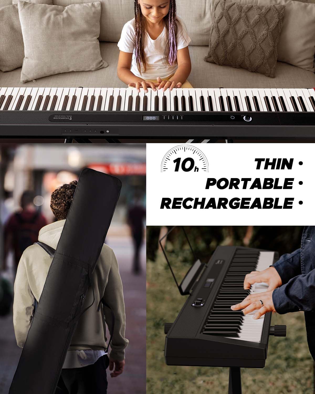 Slim Body Big Energy Digital Piano:At just 11 pounds and 2.36 inches thick, this 88-key keyboard piano easily fits into any space, making it ideal for home studios and musicians on the go. Equipped with lithium batteries, it provides over 10 hours of practice time per charge. (Please fully charge before first use)