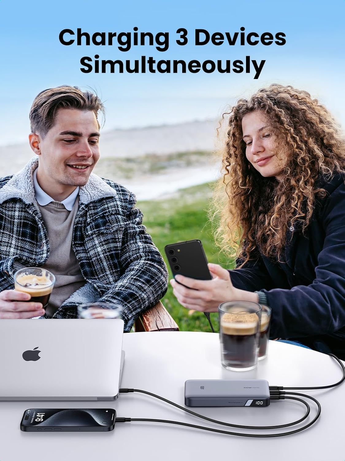 3-in-1 Fast Charging: Equipped with 2 USB C ports and one 22.5W USB A port, this powerful 100W power bank can charge 3 devices simultaneously, Macbook Pro 16″ can be charged to 42% in just 30 mins, and iPhone 15 can be charged to 55% in 30 mins